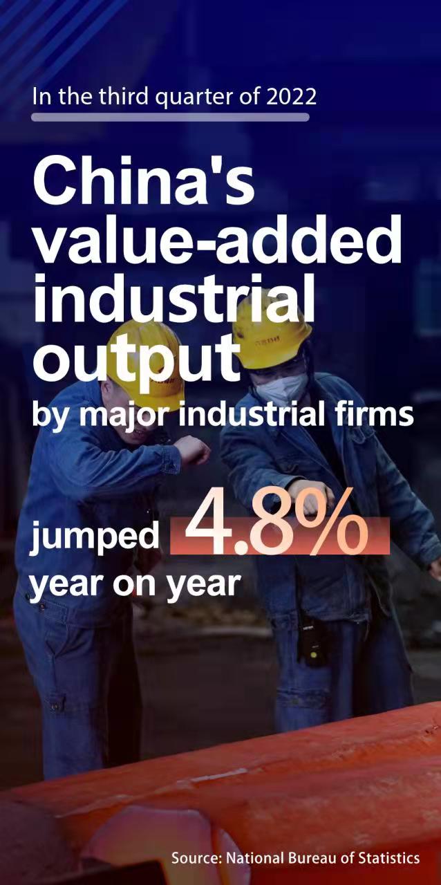 A breakdown of Monday's data showed that value-added industrial output by major industrial firms jumped 4.8 percent year on year in the third quarter, 4.1 percentage points faster than that in the second quarter.