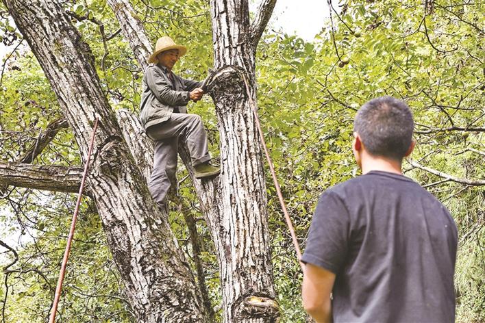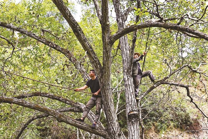 9月21日,字忠礼父子俩在树上站稳脚后,口念吉语,开竿打核桃。