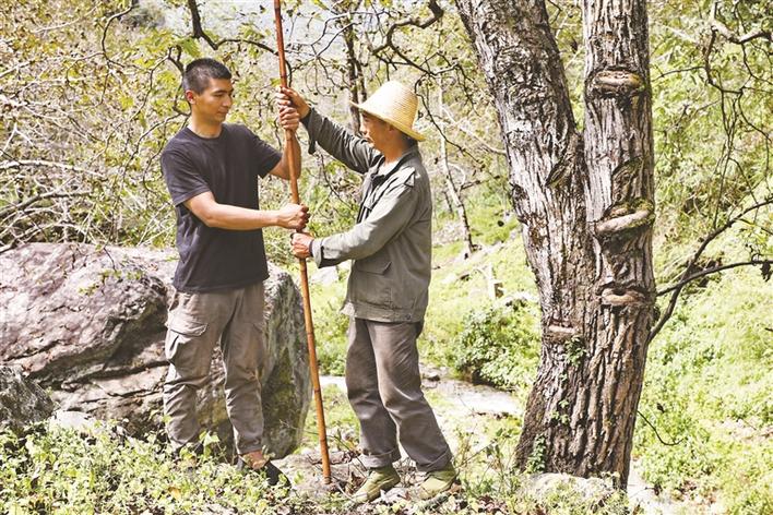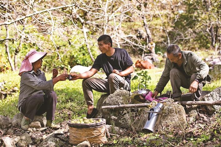 在古树核桃的见证下,简单而庄重的传竿仪式进行。字忠礼将打核桃的竹竿传递到22岁的儿子字映松手中,寓意把核桃树管护和采收的任务交给儿子。