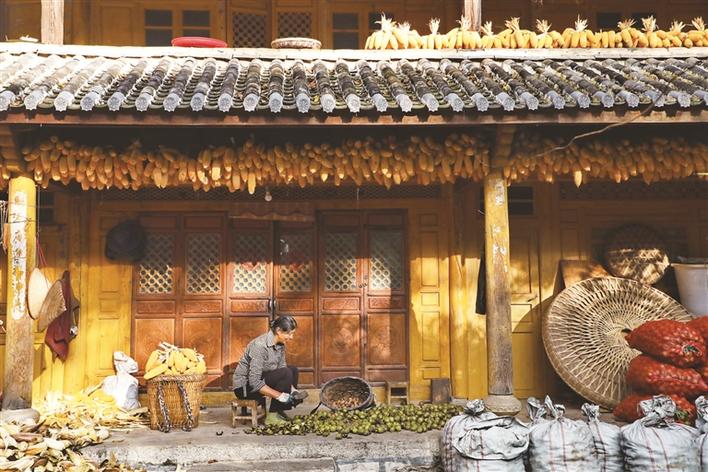 字忠礼的妻子张灿义在自家屋檐下剥离核桃青皮。