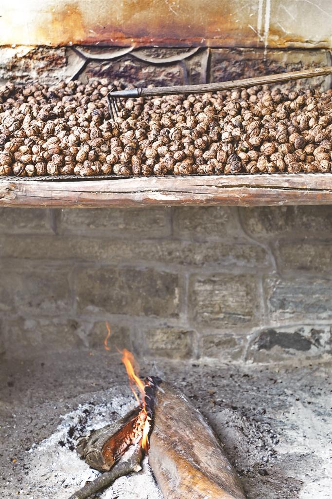 字忠礼家临时搭建的简易烤房里,剥离青皮的核桃及时进行烘烤。