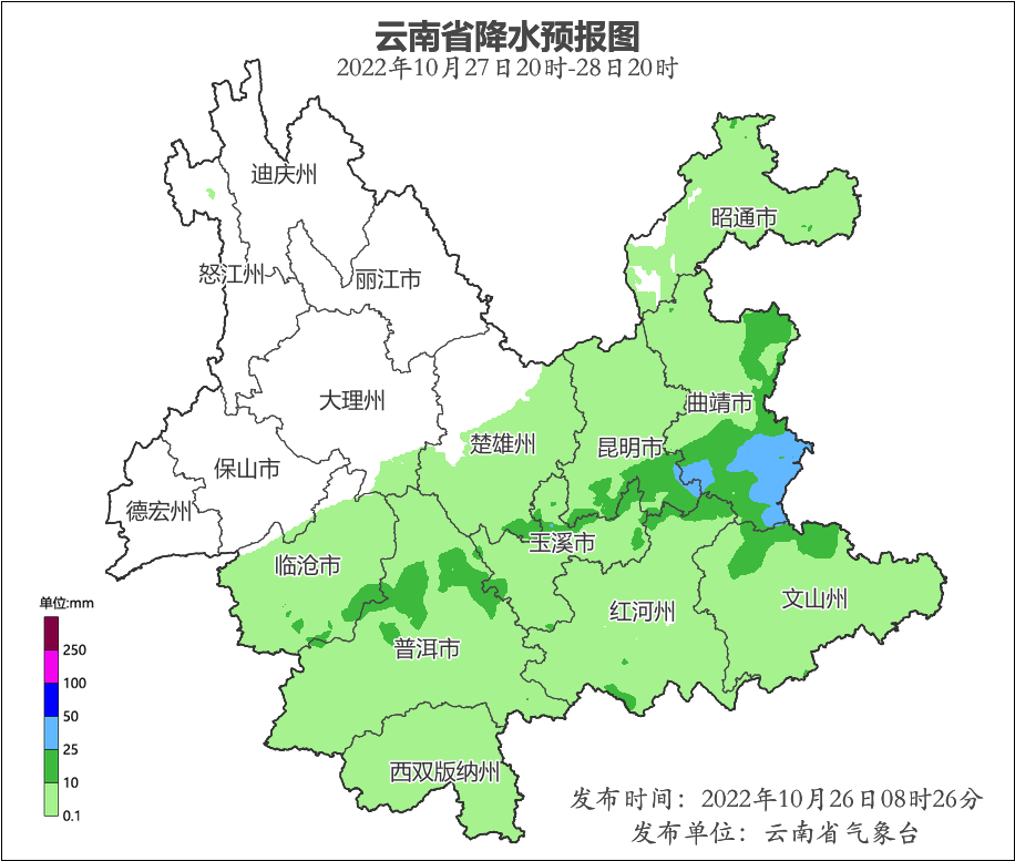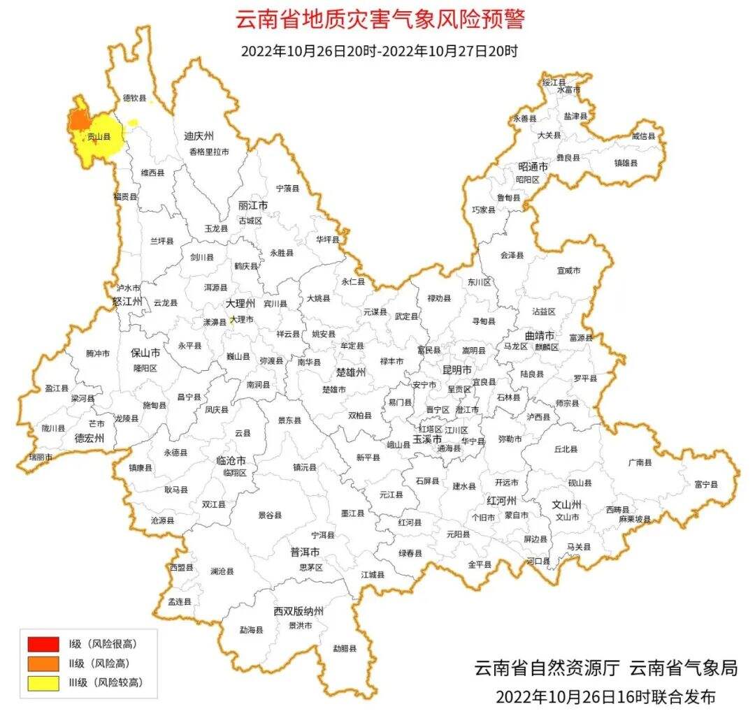 受降雨影响,2022年10月26日20:00~10月27日20:00,怒江州西北部局部区域发生滑坡泥石流的风险高;迪庆州西北部,怒江州西北部、北部,大理州中部局部区域发生滑坡泥石流的风险较高。