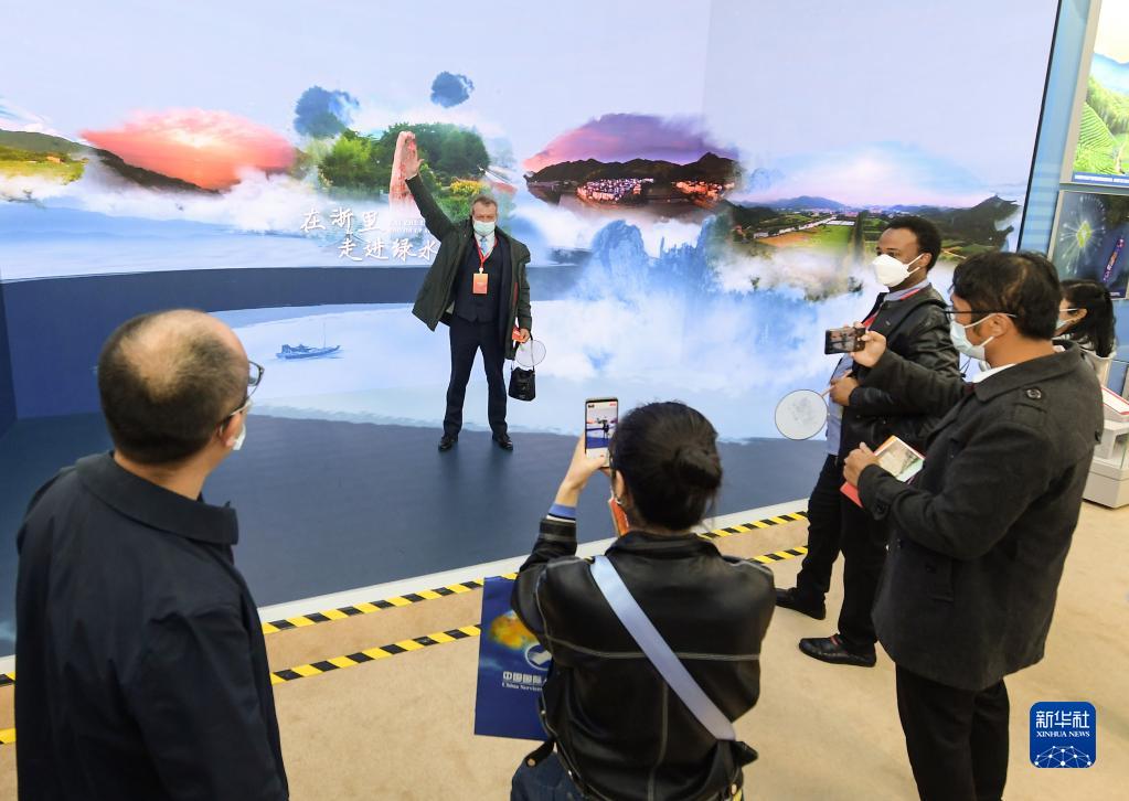 10月27日,外国嘉宾在展厅的“沉浸式体验区”拍照留念。新华社记者 李贺 摄