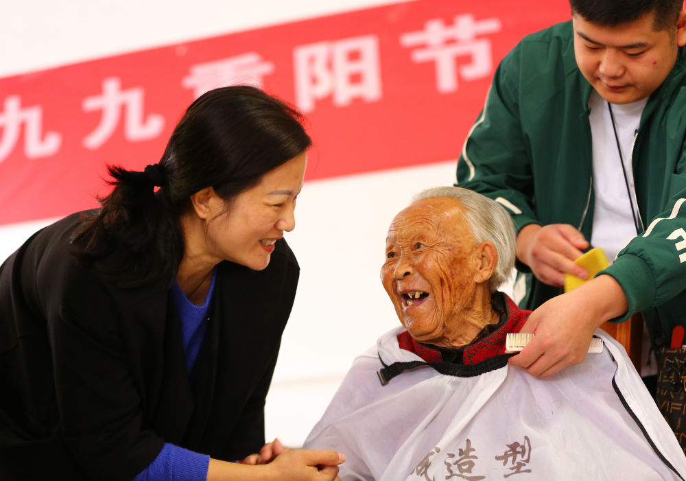 2022年10月4日,在山东省滕州市一家养老院,社会工作者为老人理发。新华社发(李志军 摄)