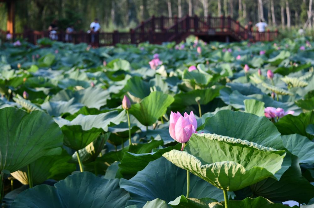 微山湖湖区内荷花盛开(2022年7月21日摄)。新华社记者 徐速绘 摄