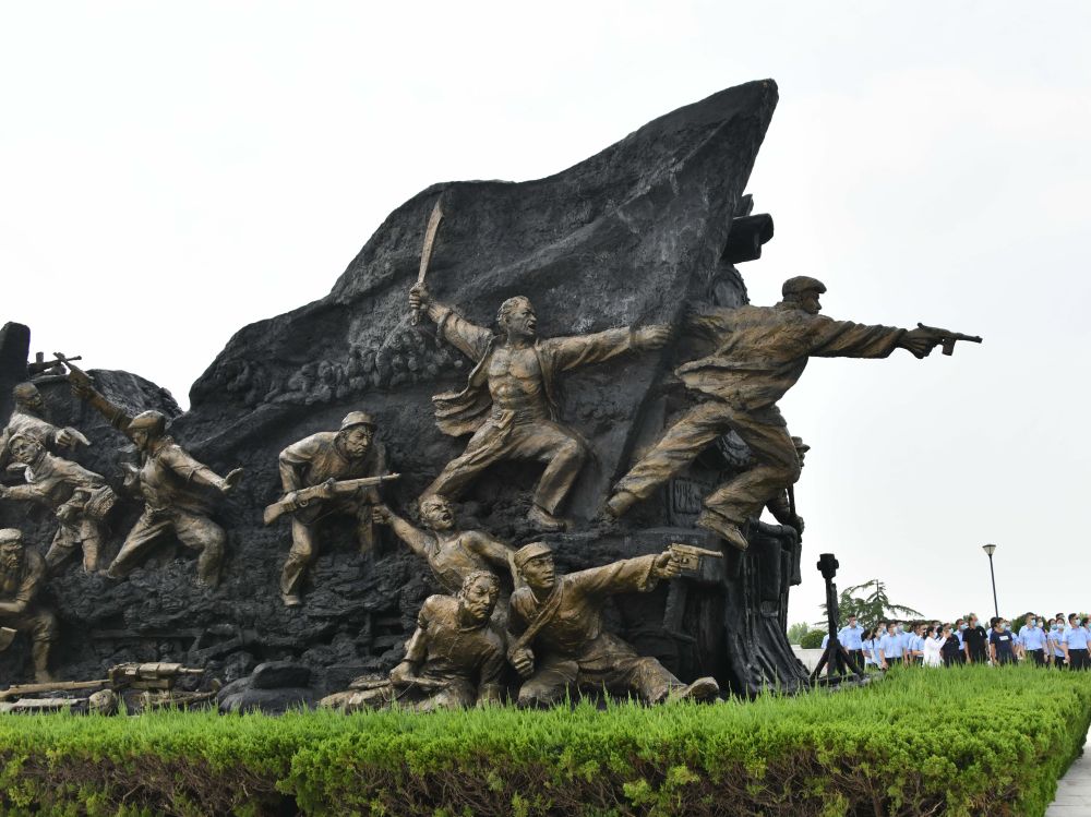 人们在山东省微山县铁道游击队纪念园内参观(2022年7月21日摄)。新华社记者 徐速绘 摄