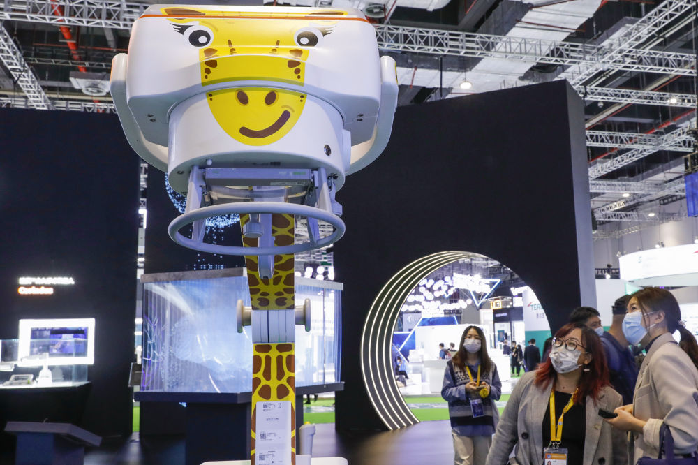 参观者在第四届进博会公共卫生防疫专区的西门子医疗展台观看一台移动式摄影x射线机(2021年11月6日摄)。新华社记者 张玉薇 摄