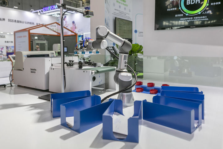 德勤公司在第三届进博会服贸展区全球首发能完成发票分拣与盖章工作的财务机器人手臂(2020年11月5日摄)。新华社记者 王翔 摄