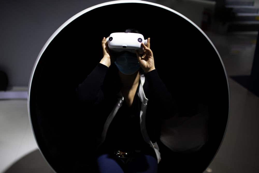 在第四届进博会技术装备展区,参观者在体验超临场感3D虚拟视频(2021年11月7日摄)。新华社记者 金立旺 摄
