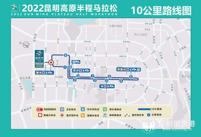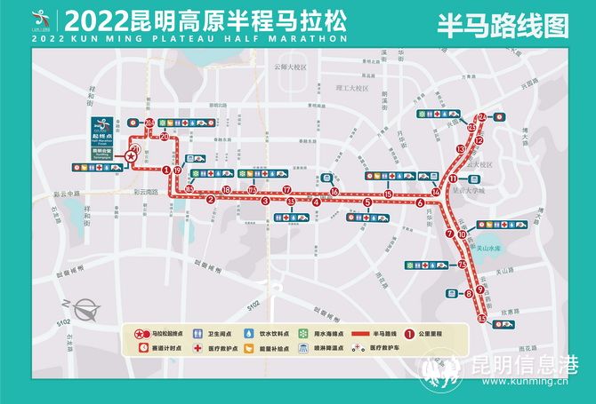 赛事延续2021年公布的赛道,将昆明会堂作为起点和终点。其中,半马的赛道为:昆明会堂(螺洲街)→左转和谐路(顺行主道)→右转锦绣大街(顺行主道)→左转彩云南路(顺行主道)→直行彩云南路(顺行主道)→右转云南白药街(主路顺行)→云南白药街与欣惠路交叉口,地铁1号线大学城南站(折返)→直行云南白药街(顺行主道)→兴园路云南白药街交叉口(折返)→直行云南白药街(顺行主道)→右转彩云南路(顺行辅道)→直行彩云南路(顺行辅道)→右转锦绣大街(顺行主道)→左转春融东路(顺行主道)→右转朝云街(顺行主道)至折返点(折返)→右转春融东路(逆向直行春融东路主道)→左转螺洲街(终点)。