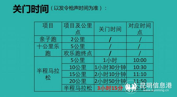 亲子跑和十公里乐跑不设关门时间,半程马拉松的关门时间为3小时15分钟,即在比赛当日12:15分关门。