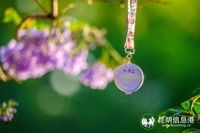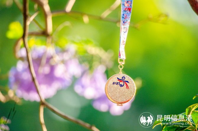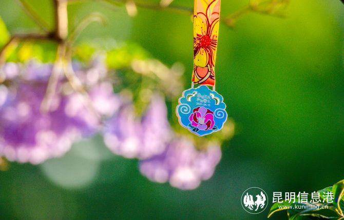 亲子跑完赛奖牌继续沿用“百岁锁”设计, 承载着平安健康、茁壮成长的祝福,奖牌正面绽放着一朵美丽的昆明市花山茶花。
