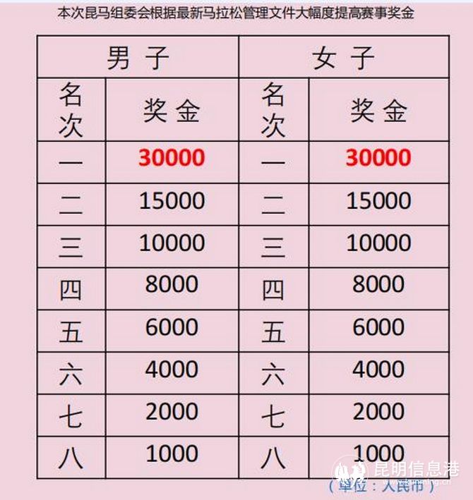 本次比赛奖金大幅提高,半程马拉松的男女组第一名,都可以获得3万元人民币的奖励。第二名的奖金为1.5万元人民币,第三名的奖金为1万元人民币。第八名也可以获得1000元人民币。
