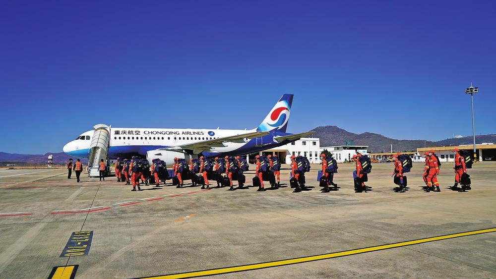 一阵急促的警报声传来,大理州森林消防支队救援车辆通过快速通道驶入大理市凤仪机场航站楼。随着指挥员一声令下,消防救援人员携带背囊和救援装备在候机楼前整齐列队。11月10日,一场以某地发生特大地震为背景的救援力量航空投送拉动演练正式展开。