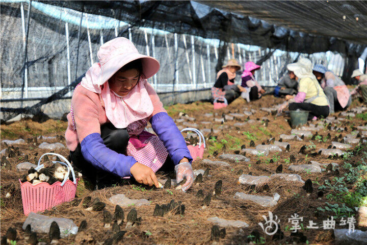 每年6月至11月正值姬松茸采摘的时节,走进麒麟区茨营镇杨家村的姬松茸棚,一朵朵姬松茸远远地就散发着清香,每一张菌床上都长满了圆溜溜、胖嘟嘟的姬松茸,甚是招人喜欢。工人正在大棚里小心翼翼地采摘着新鲜的姬松茸,脸上洋溢着丰收的喜悦。