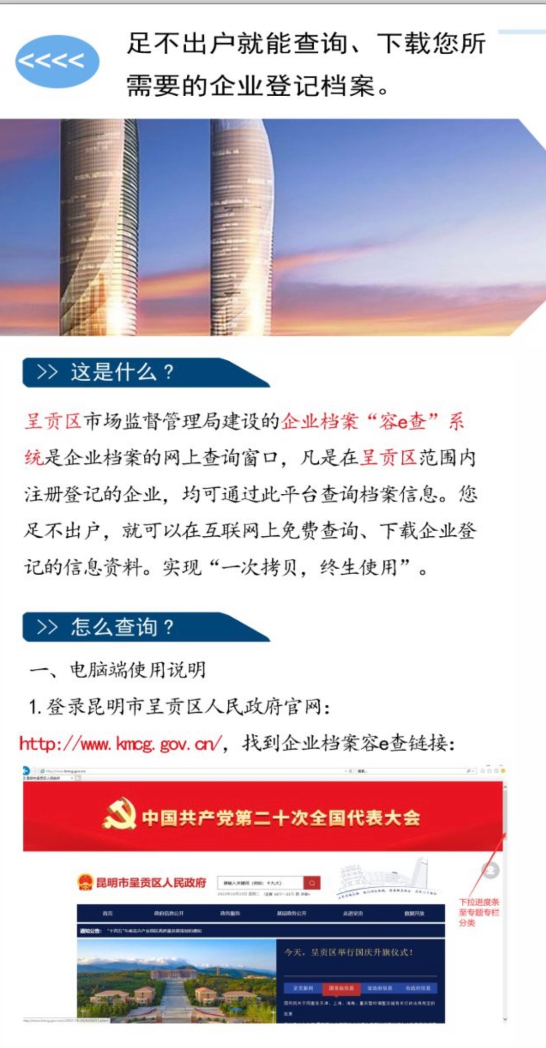 今后,凡是在呈贡区注册登记的企业,通过互联网(昆明市呈贡区人民政府官网)便可查询、下载加载呈贡区市场监管局水印和市场主体信息查询专用章的电子档案,使企业“一次下载、终身受用”,真正实现企业档案查询“网上办、零见面、零跑腿”目标,将呈贡区乃至昆明市的营商环境又推上了一个新的高度。