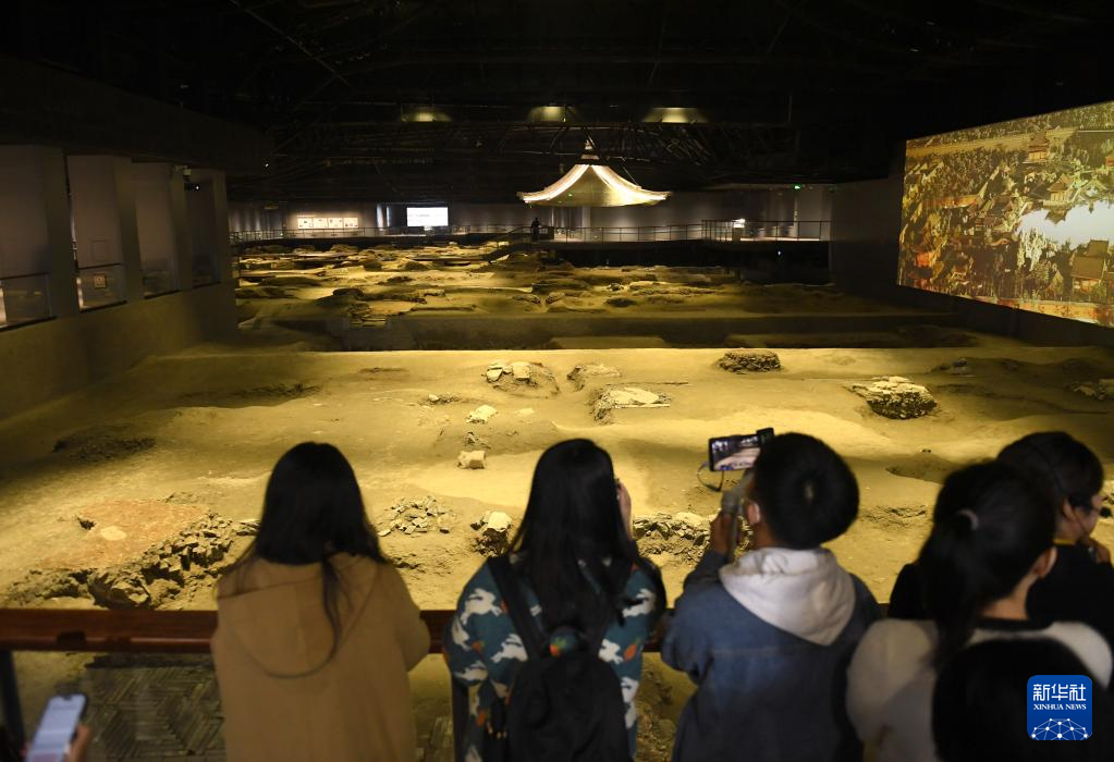 11月14日,媒体记者参观南宋德寿宫遗址博物馆展示的宫苑建筑遗迹。新华社记者翁忻旸/摄
