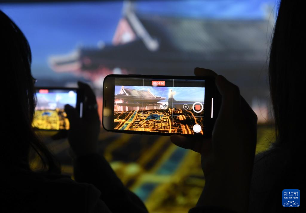 11月14日,两名女子在拍摄南宋德寿宫遗址博物馆利用空间投影技术在宫苑建筑遗迹上呈现的皇城景观。新华社记者翁忻旸/摄