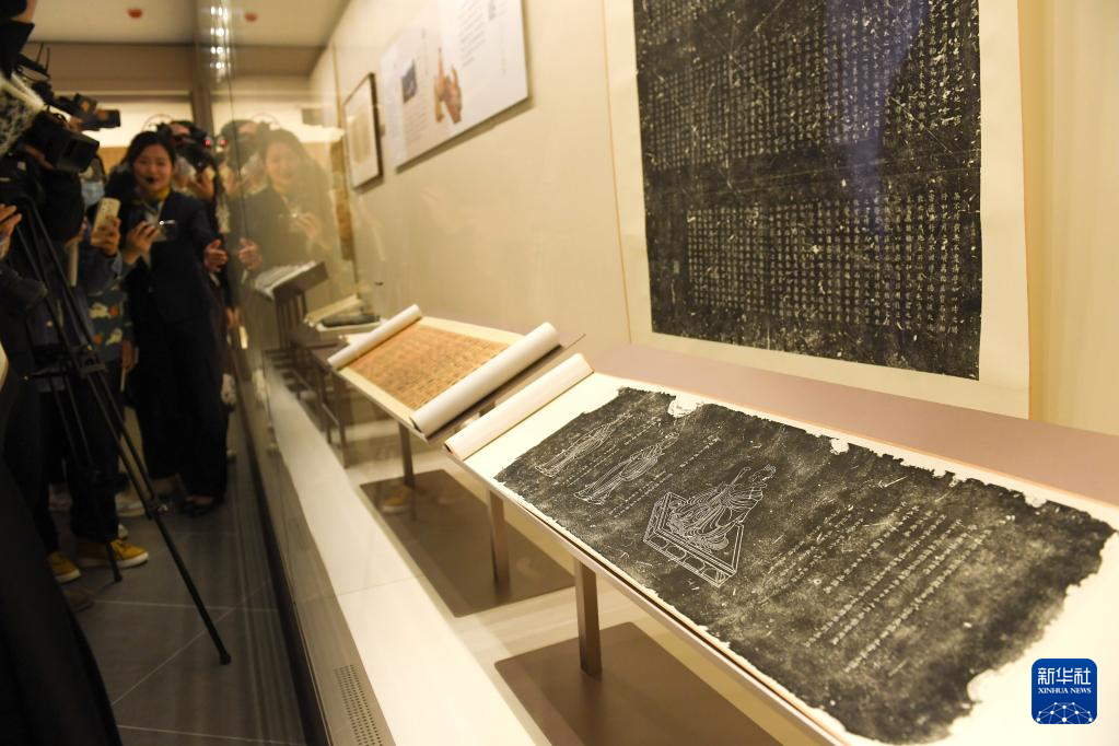 11月14日,讲解员在介绍南宋德寿宫遗址博物馆内展陈的南宋刻《孔子及七十二弟子像赞》石刻拓片。新华社记者翁忻旸/摄