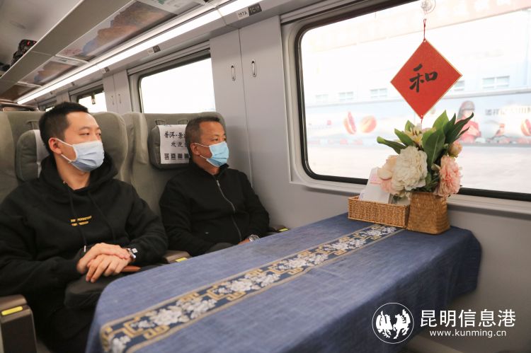 昆明局集团以打造中老铁路高品质列车服务为目标,积极为旅客提供安全、舒适的安馨旅途。比如,在列车摆台装饰上下足功夫,餐吧和一等座以“祥和”为主题进行布置,以中老两国国花牡丹花和占芭花相互点缀融合,寓意“吉祥如意、和平共处、中老友谊、万古长青”。途中以旅客需求出发,创新服务举措,在餐吧车设立“安馨服务站”,为旅客提供U型枕、三合一数据线、针线盒、老花镜、防潮垫、儿童(成人)口罩等温馨服务备品,给乘车旅客带来更安全、更温馨、更便捷的乘车体验。6号车厢乘务室设立“妈咪小屋”,为旅客提供母婴哺乳帘、独立包装不同型号的尿不湿、婴儿湿巾、棉柔巾、免洗消毒凝胶、玩具等贴心服务备品。