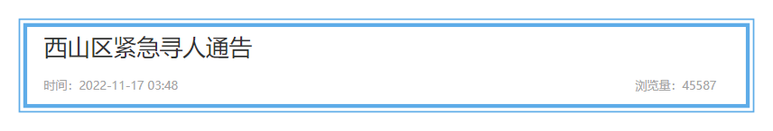 11月17日,西山区发布紧急寻人通告,2022年11月12日0时至17日0时,在西山区海口街道云磷小区、西山区海口街道云天化金汉有 限公司、西山区海口街道云磷小区农贸市场相关区域有活动轨迹的人员及与该区域人员有接触的人员,请立即向所在村(社区)报备,配合落实流调排查、核酸检测等措施。详情如下: