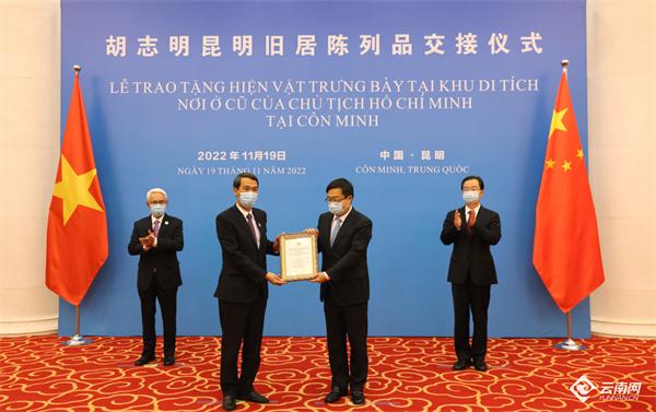 会见结束后,王宁和范星梅共同见证了胡志明昆明旧居陈列品交接仪式。