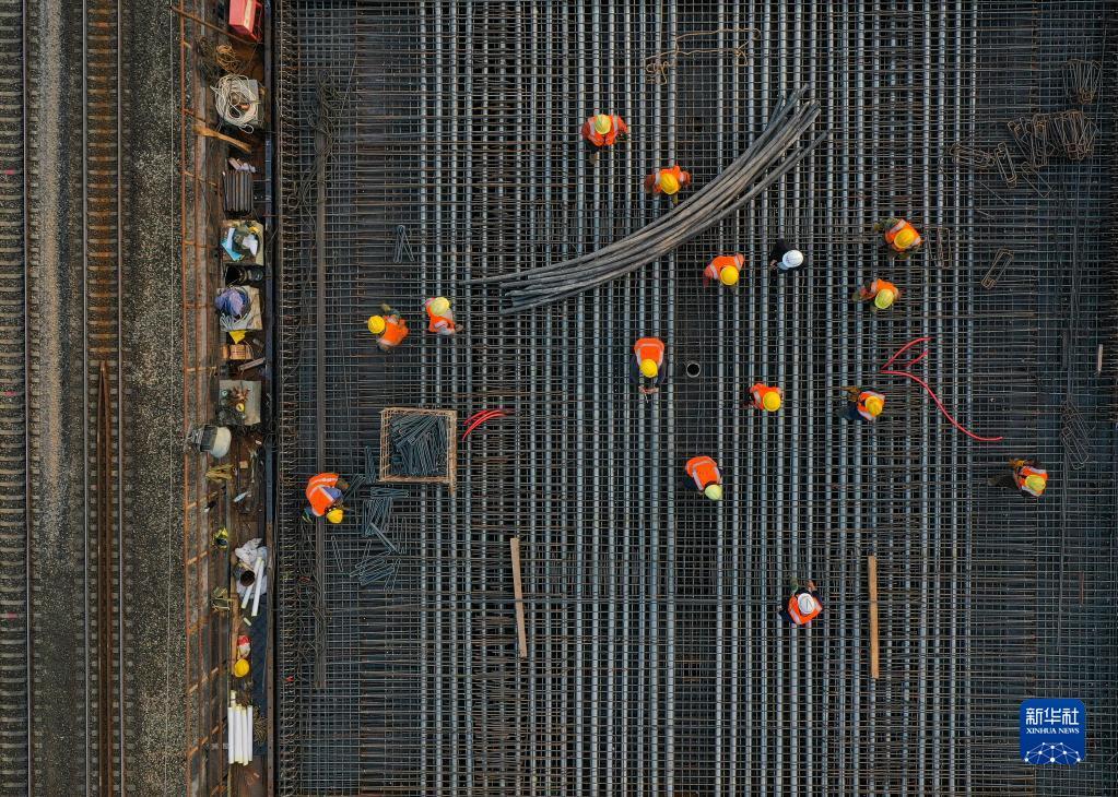 11月28日,工人在渝昆高铁川渝段华福特大桥施工现场作业(无人机照片)。记者王全超/摄