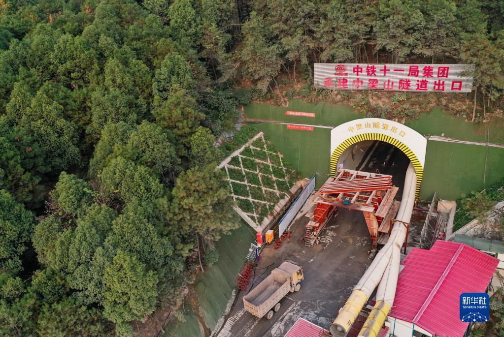 这是11月28日拍摄的渝昆高铁川渝段中梁山隧道施工作业现场(无人机照片)。记者王全超/摄