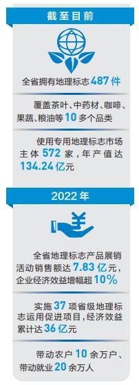 截至目前,全省拥有地理标志总数达487件,其中地理标志证明商标336件、地理标志保护产品65件、农产品地理标志86件,位居全国前列,覆盖茶叶、中药材、咖啡、果蔬、粮油等10多个品类,涉及全省所有州(市)特色产品。使用专用地理标志市场主体达572家,年产值134.24亿元。