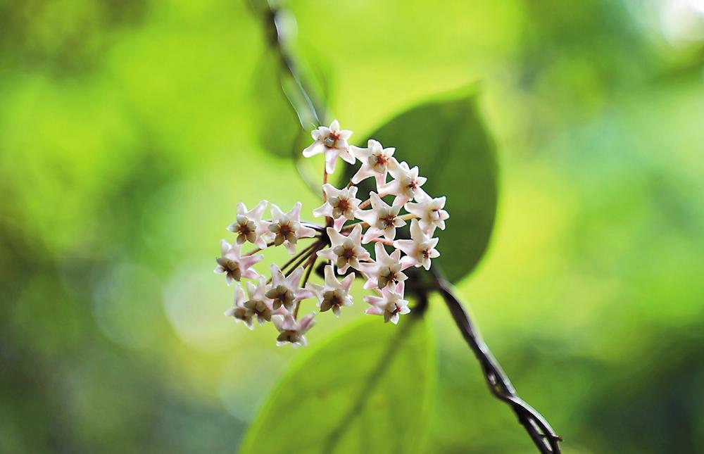 资料显示,球兰属植物主要有攀援型和悬垂型两种类型,因其伞状花序常为球状,花幽香如兰,故名为球兰。凸脉球兰属于附生植物,粉色花冠呈五角星状展开,副花冠裂片的外角尖锐,花色晶莹剔透十分漂亮,具有较高的观赏价值。凸脉球兰属中国特有物种,在云南主要分布于普洱、西双版纳、临沧等地区。