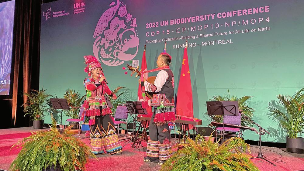 12月7日,在COP15第二阶段会议中国政府主办的主席国招待会上,伴随着一声悠长的歌声,云南海菜腔响彻蒙特利尔会议中心,成为首支在大会亮相的云南民族歌舞。“金鸟银鸟飞起来。”来自主席国的代表朋友们相聚在一起,观看四弦烟盒乐器表演,聆听彝族的原生态海菜腔。