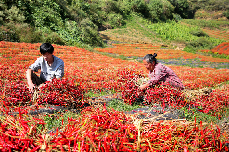 在乐业镇肖岗农业种植合作社,800多亩成熟的辣椒格外引人注目。正在劳动的村民陈彩芸介绍,合作社种植的这种辣椒个头不算大,但卖相非常好,他们每天采摘的辣椒全部被客商收购。“在家门口干活,既能照顾家,每天还能挣100多元钱。”这份“工作”让她很是满意。