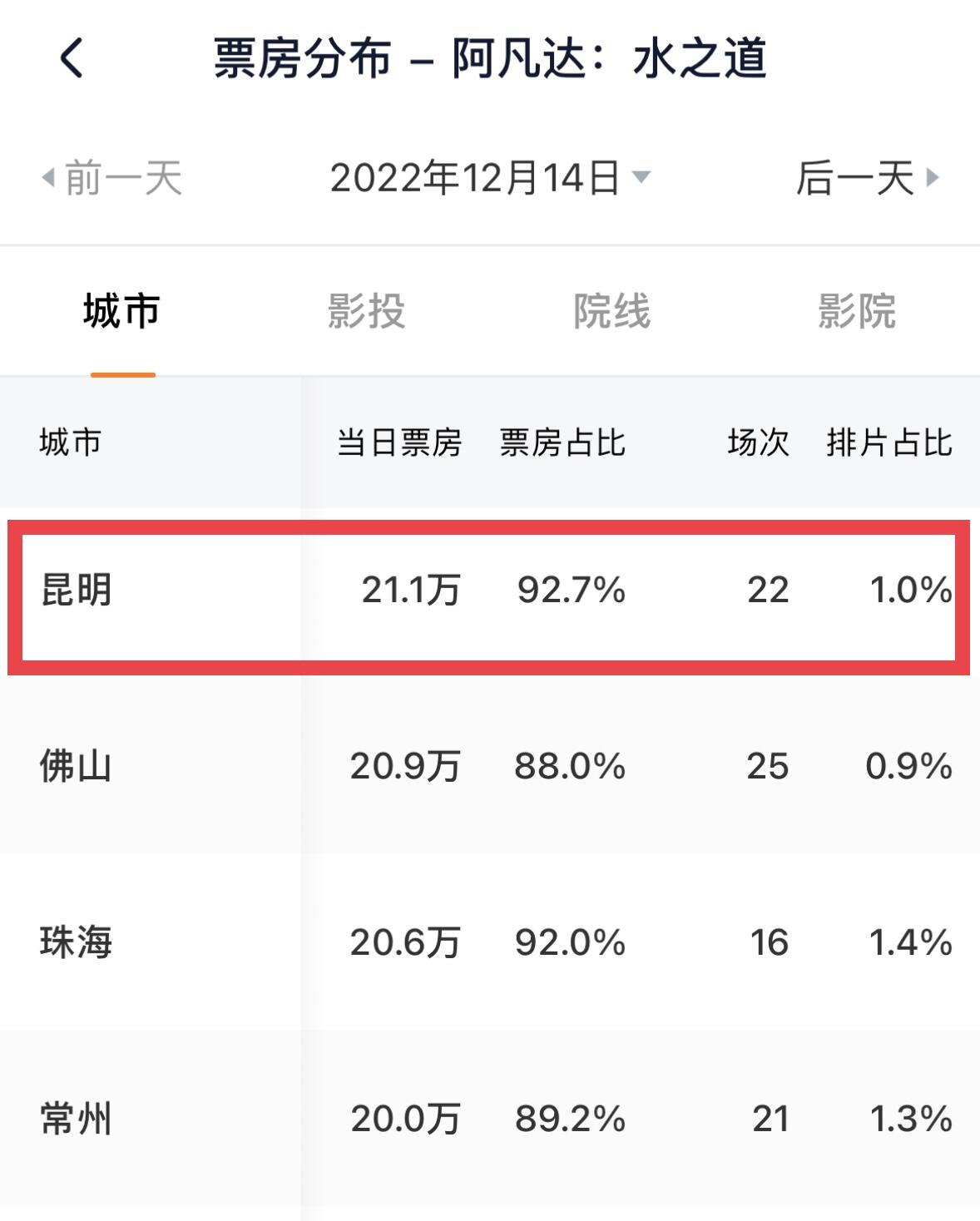 12月14日,备受期待的《阿凡达》系列第二部——《阿凡达2:水之道》(以下简称《阿凡达2》)在昆明各大影院开启点映。根据灯塔专业版数据,截至今日16时,昆明点映首日票房已突破21万元,达到21.1万元,票房占比92.7%,点映场最高票价更是达到了188元一张。