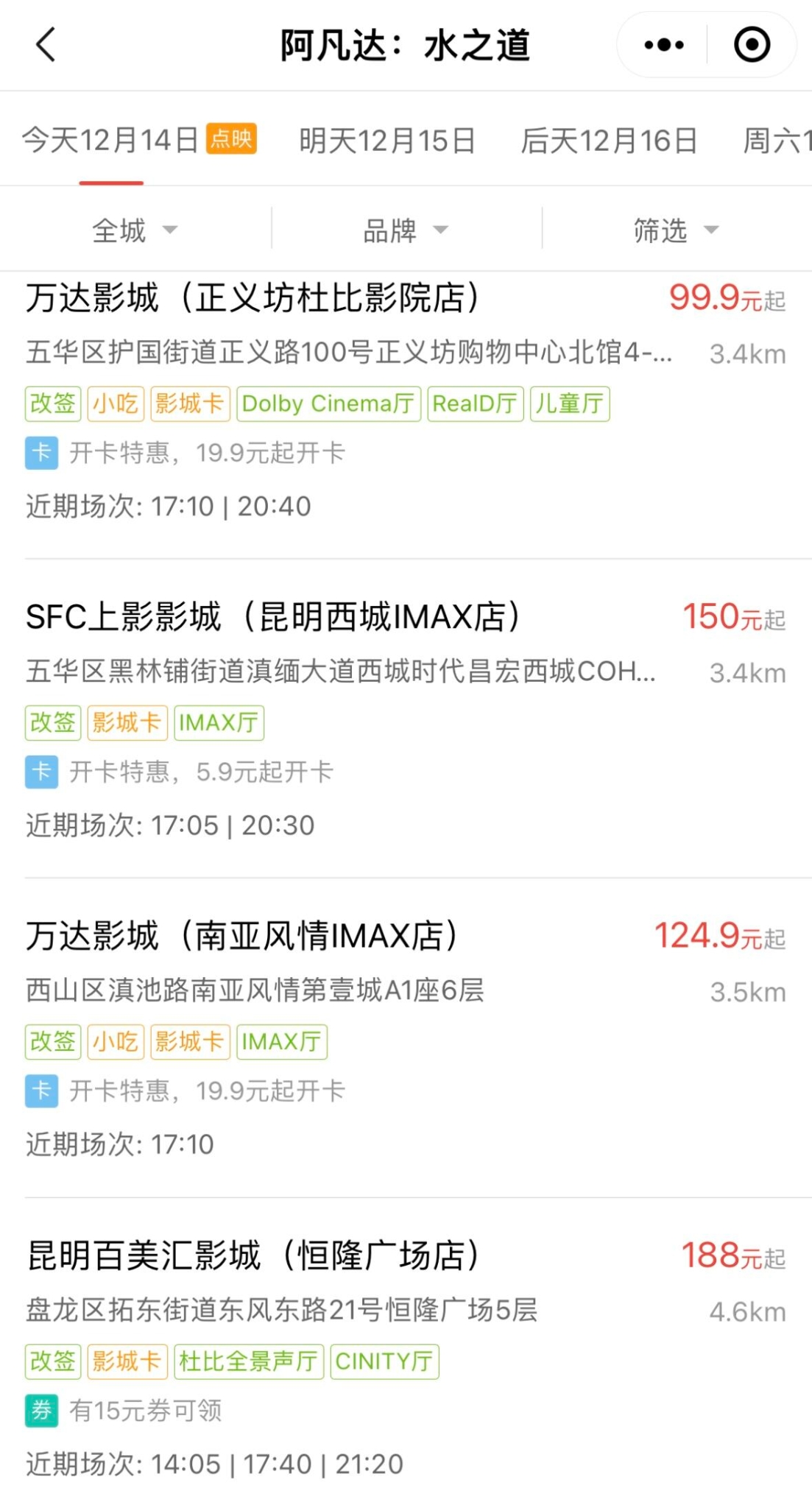 从目前昆明各家影城的售票情况来看,全市一共有11家电影院参与了《阿凡达2》14日的点映,最高票价出现在昆明百美汇影城(恒隆广场店),14日当天的CINITY厅点映场票价为188元一张。目前看,该影院今日全部三场次中间以及靠中间的好位置都已经售出。