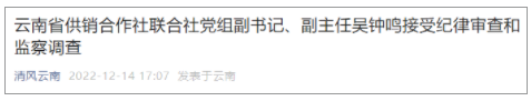 12月14日,据云南省纪委监委消息:云南省供销合作社联合社党组副书记、副主任吴钟鸣涉嫌严重违纪违法,目前正在接受纪律审查和监察调查。