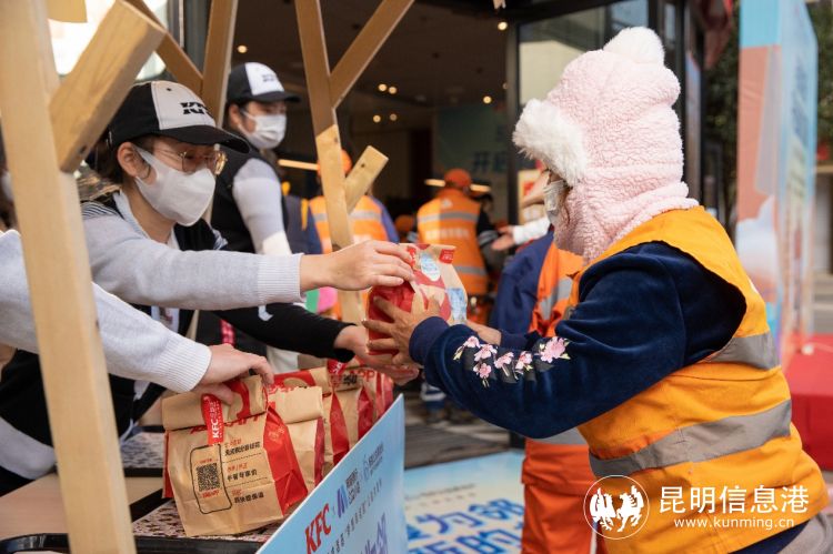 12月15日,由昆明市委网信办、昆明市城管局指导,积极发挥网商银行、肯德基等企业及昆明市新媒体平台等社会群体力量,以“公益K套餐 温暖一座城”为主题的暖冬公益活动拉开序幕,将在12月15日-24日的十天时间里,为昆明全市的环卫工人免费提供10000份早餐。