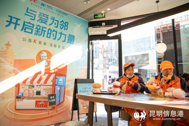 12月15日-12月24日期间,每天早上6点到8点,昆明的环卫工人在25家肯德基餐厅,报暗号“K套餐”即可领取一份免费早餐,套餐内容包括雪菜笋丁鸡肉粥和安心油条各一份,让这些“城市唤醒者”们能在冬天寒冷的早晨暖暖胃。