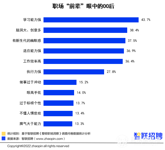 调研显示,“学习能力强”“脑洞大、创意多”“有新生代的幽默感”,位列职场人对00后的评价前三名。至于网络上诟病00后的“做事过于冲动,不考虑后果”“眼高手低,难以踏实做事”“过于标榜个性,不好管理”等负面评价,占比均低于20%。