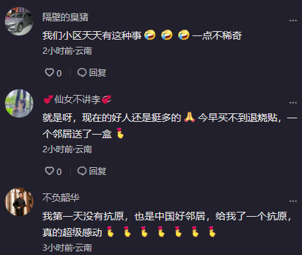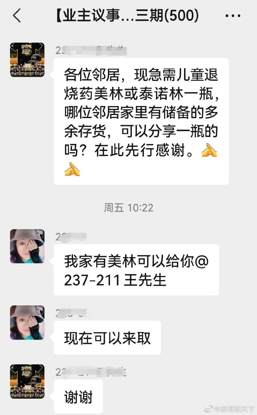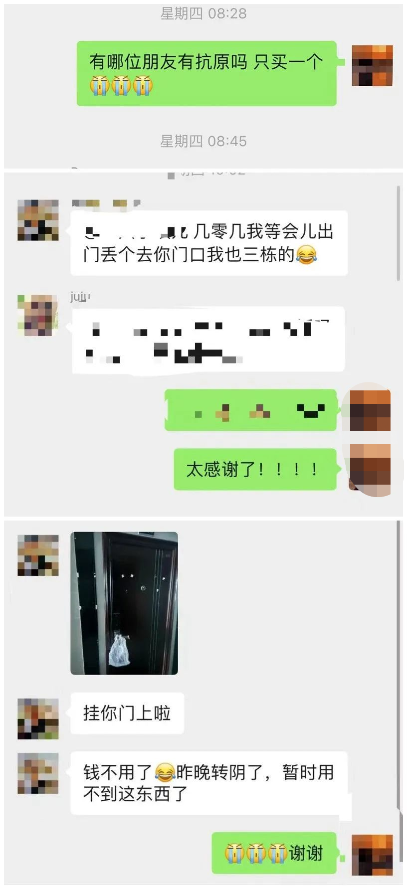 家住科普路一小区的小禹这两天正独自一人居家隔离中。刚开始隔离就发起了高烧,手中又没有抗原测试剂,她只好在微信群中向邻居们求助。让人没想到的是,善意来的比想象中更快。