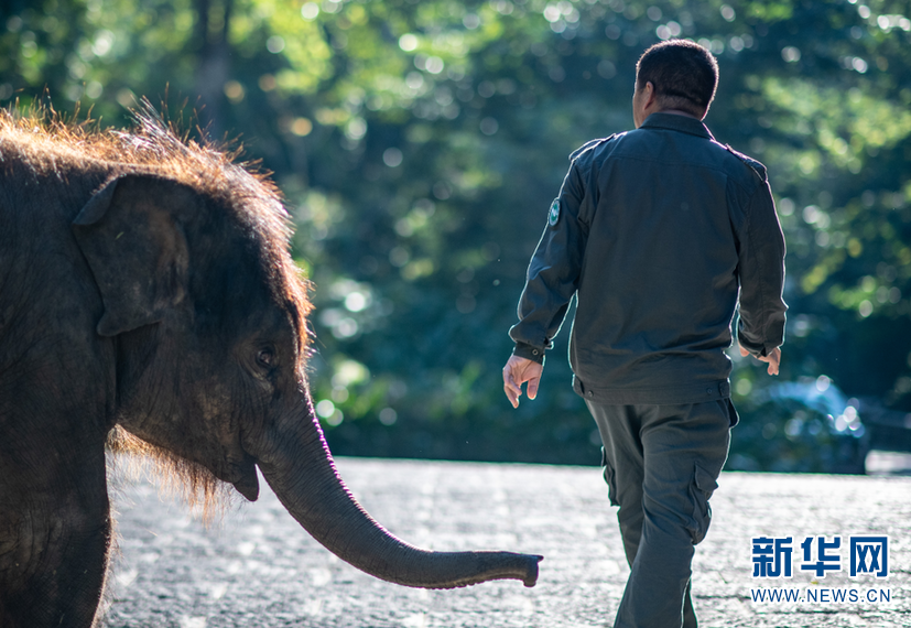 亚洲象“龙龙”跟着专职驯养员外出觅食(11月13日摄)。新华社记者 江文耀 摄