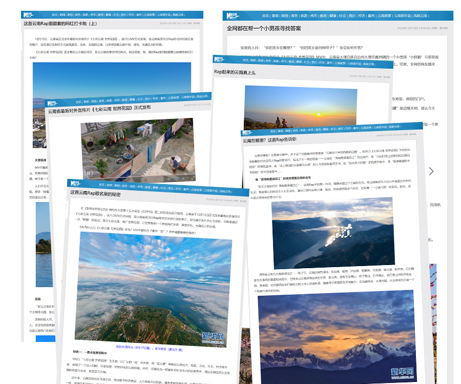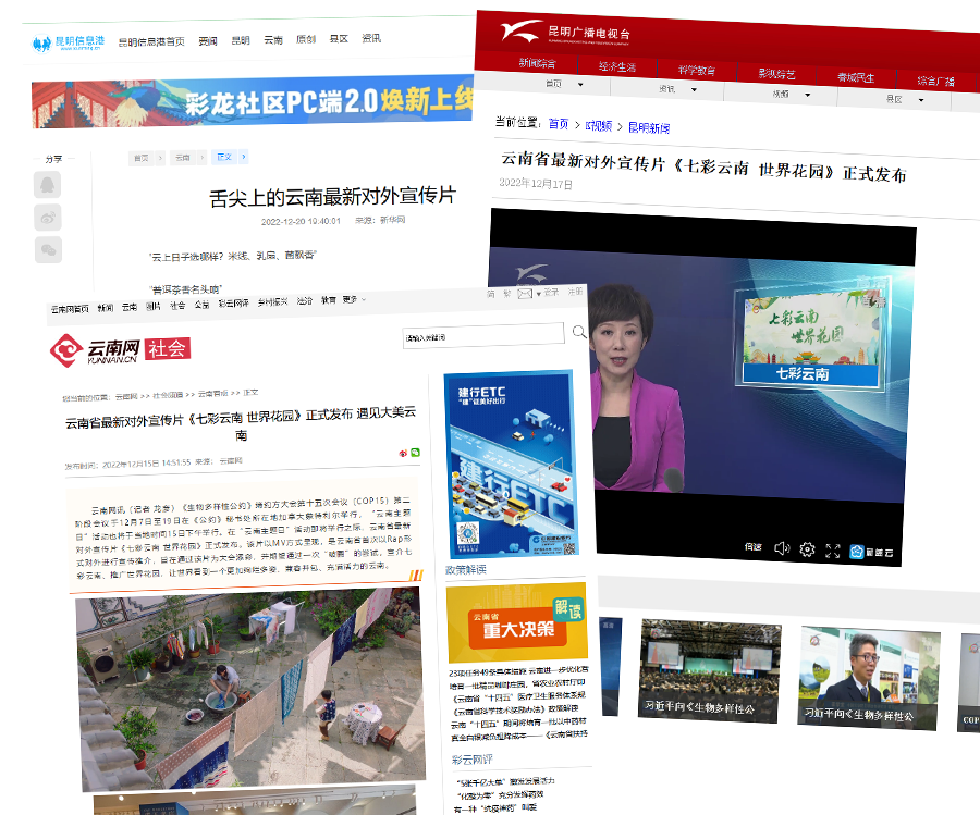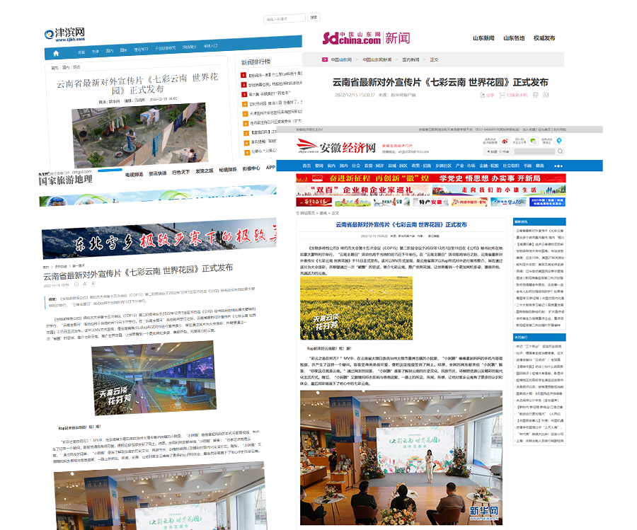 12月15日,云南省最新对外宣传片《七彩云南 世界花园》中英文版正式发布。截至12月22日12时,全网相关报道累计传播超5000次,全网累计阅读量超1.6亿次。值得一提的是,20多个国家和地区的500多家媒体对英文和法文稿件进行了报道与转载,平均潜在受众超约60.2万人,媒体覆盖人群超过3亿。