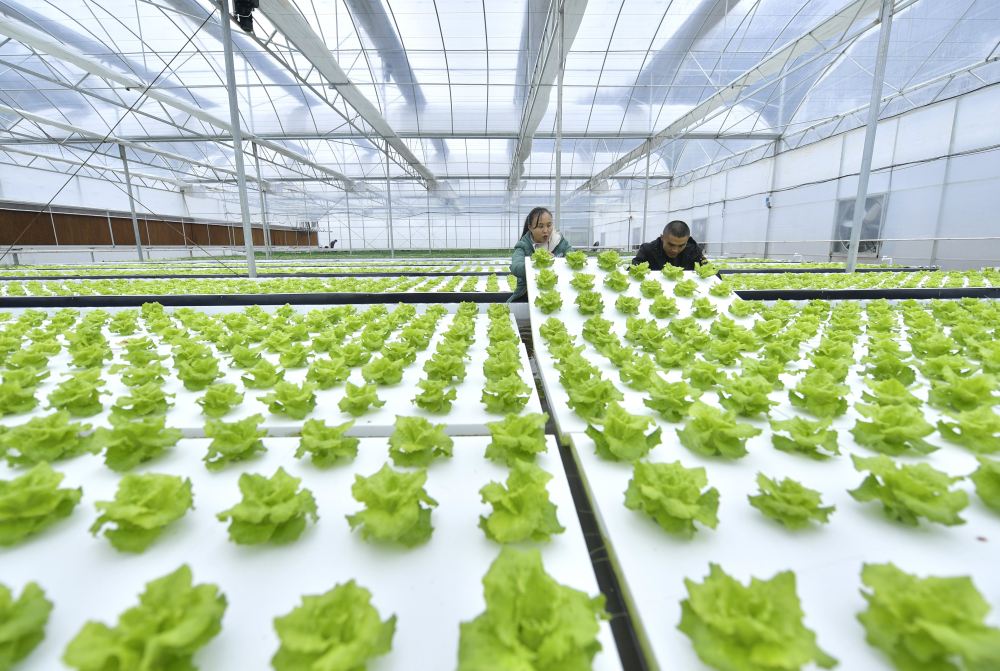 2022年11月29日,湖北省宣恩县椒园镇锣圈岩村的农民在温控大棚里检查水培蔬菜的生长情况。新华社发(宋文摄)