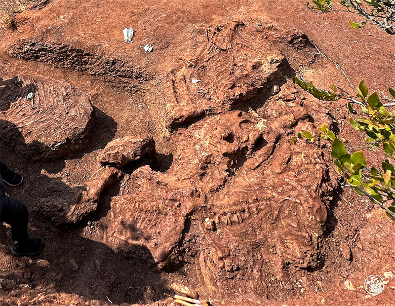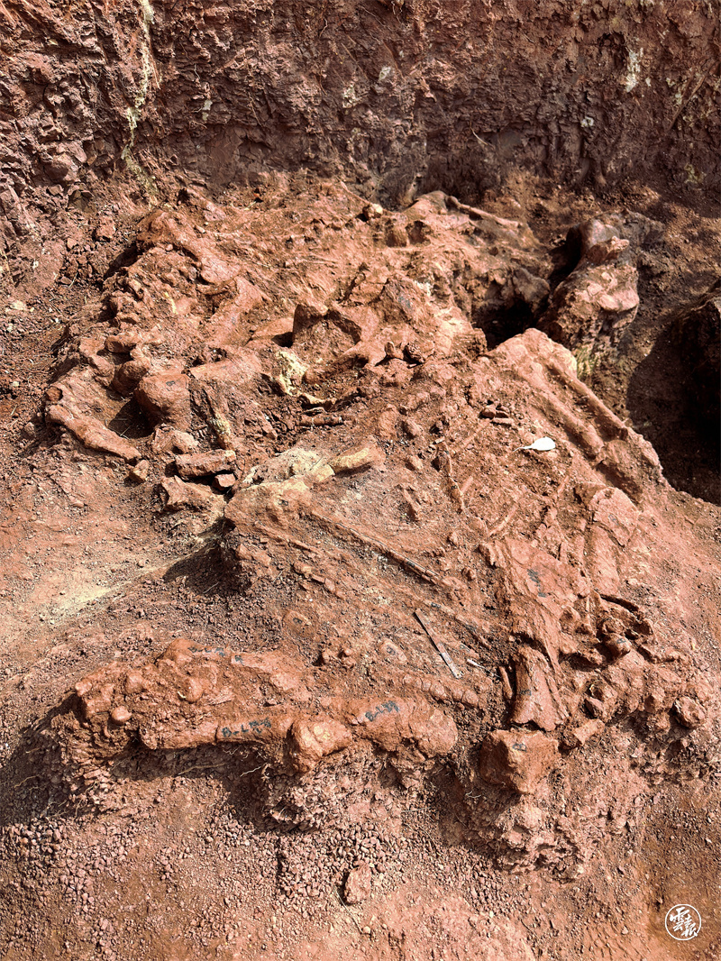 12月28日,昆明气温骤降,但在距昆1个多小时车程的楚雄彝族自治州禄丰县,曾经植物茂盛、气候温暖的恐龙天堂依旧暖阳如春。三具新鲜出土的恐龙化石躺在恐龙山镇的一处山坡上,骨骼形状清晰可辨,其中一具较大体型的恐龙化石,腹膜肋骨历历可数。
