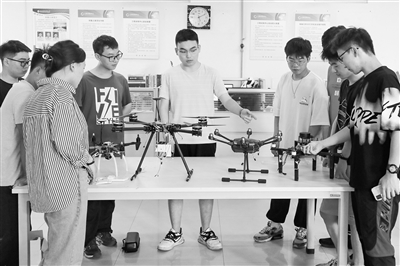 西北农林科技大学农科专业学生在工程训练中心讨论农用无人机的原理与结构。刘家/摄