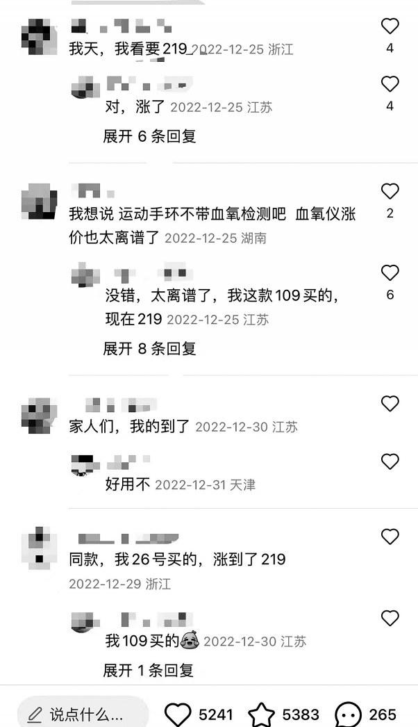 与此同时,血氧仪价格上涨也引发关注。记者浏览多个社交平台发现,反映血氧仪涨价的帖子不少,各大品牌的血氧仪价格都不同程度上涨。网友“雨洋洋”发帖说:“一个月前看指夹式血氧仪时99元一台,这几天已经涨到230元一台了。”2022年12月29日,#1380元血氧仪成本仅几十块#成为微博热搜话题,网友吐槽商家的抬价行为,呼吁相关部门加强市场监管。不少网友表示,血氧仪售价高昂,还不如直接购置智能手表。但也有网友反驳称,智能手表测量结果不准确,误差较大。