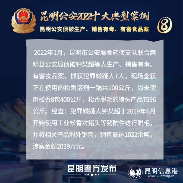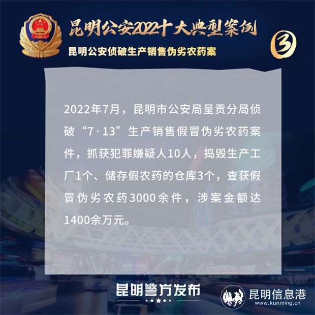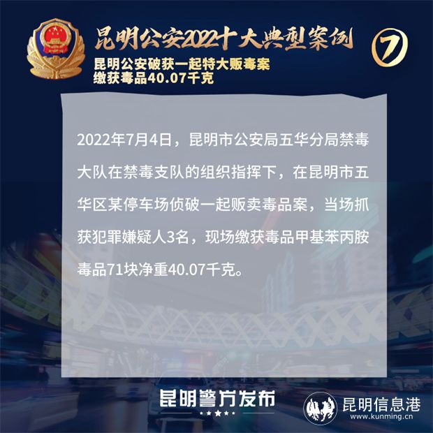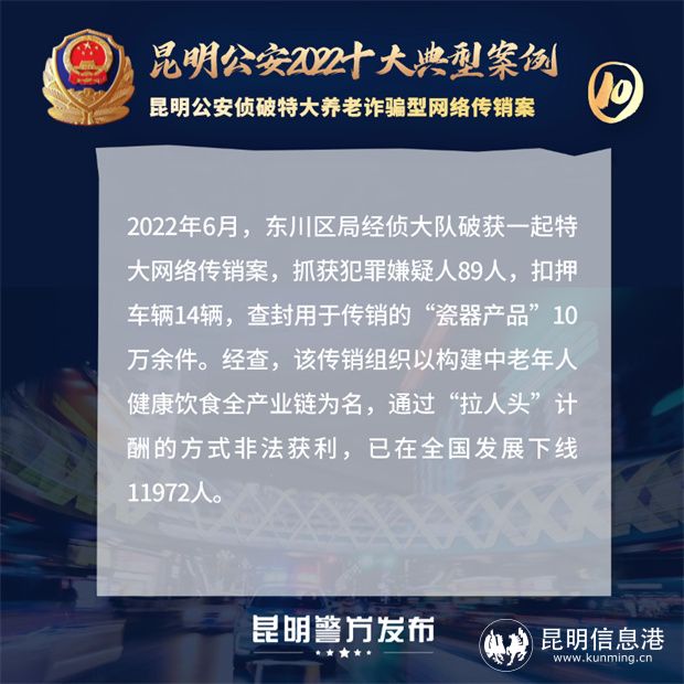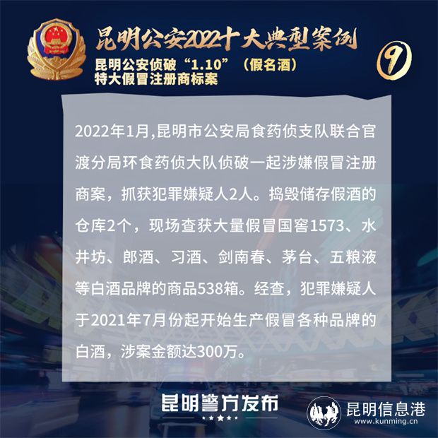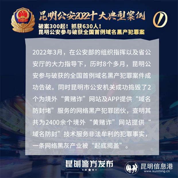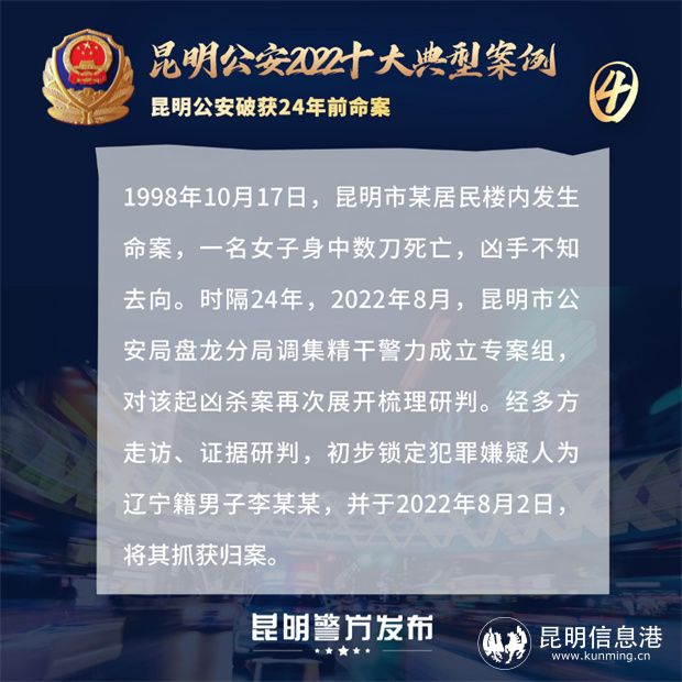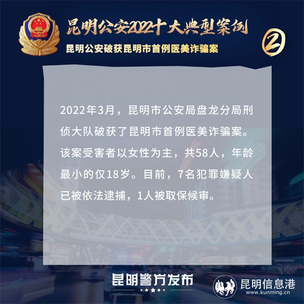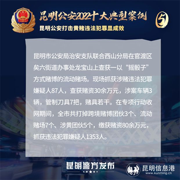 6686体育讯 记者合宇聪 1月5日,昆明市公安局发布“2022年度十大典型案例”。2022年,昆明公安始终坚持“零容忍”态度,严打各类违法犯罪行为,切实维护人民群众的生命财产安全,充分体现昆明公安“排头兵、支撑者、展示者”三个定位的责任与担当。