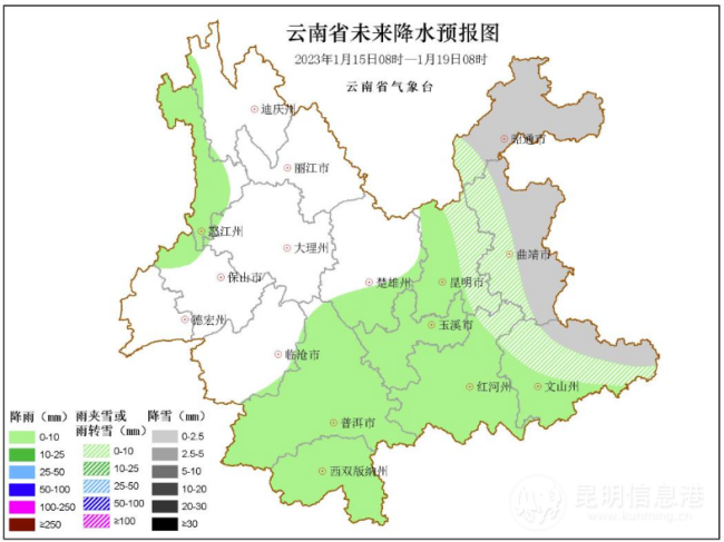 预计1月15-16日,昭通、曲靖东部、文山东部阴有小雪,曲靖西部、昆明东部、红河北部阴有雨夹雪,高海拔地区有中到大雪;昆明西部、玉溪东部、红河、文山南部、怒江北部多云间阴局部有小雨,其它地区多云间晴。1月17-18日,昭通中北部、曲靖东部、文山北部阴有小雪或雨夹雪,昭通南部、曲靖西部、文山南部、红河、昆明、玉溪、楚雄南部、普洱、西双版纳、怒江、保山北部多云有阵雨,其它地区多云。
