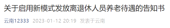 1月12日,“云南12333”微公号发布《关于启用新模式发放离退休人员养老待遇的告知书》。