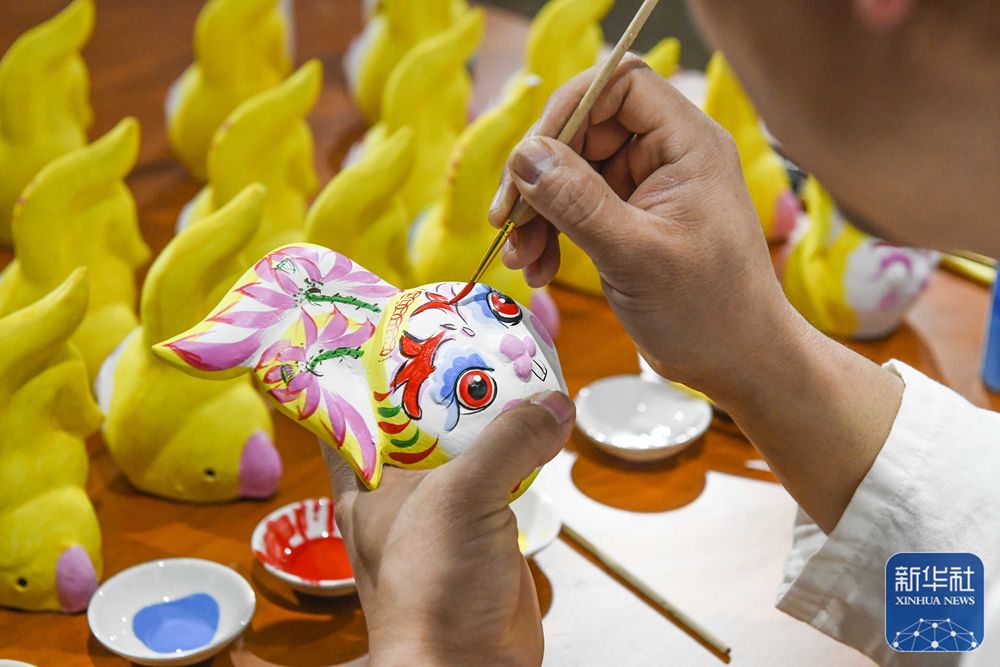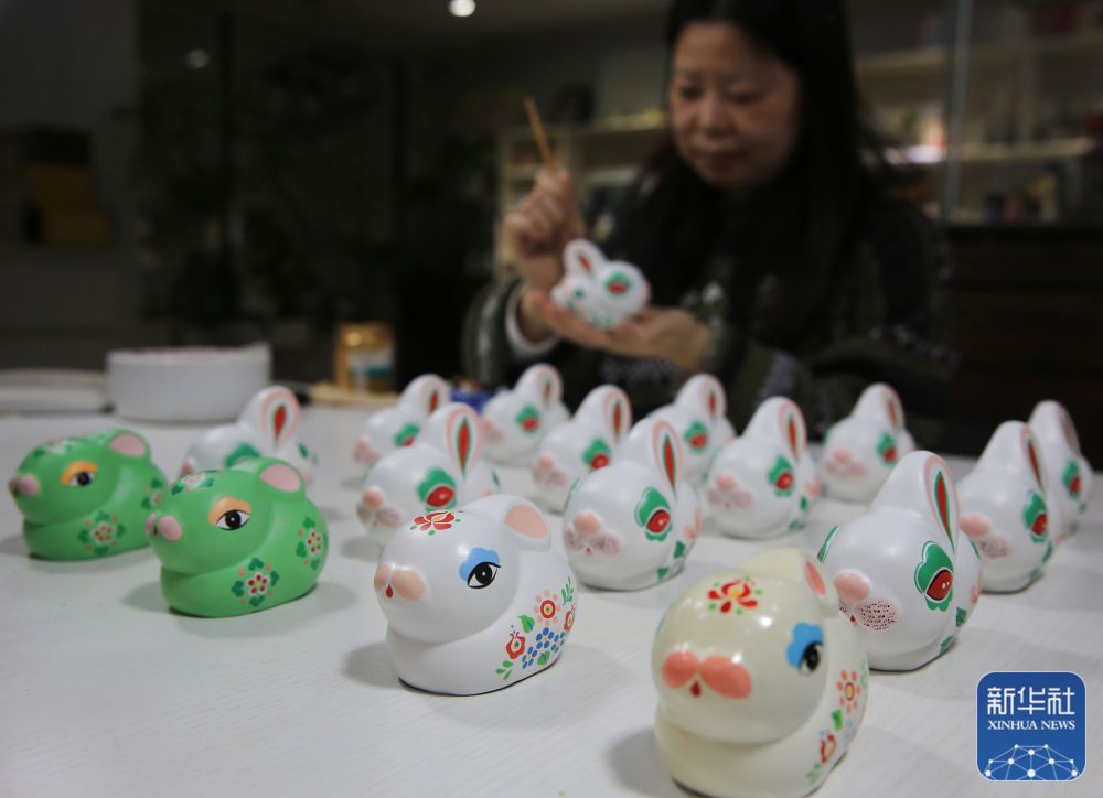1月16日,河北省玉田县一家泥塑工坊的民间艺人在给生肖兔作品着色。新华社发(刘满仓/摄)