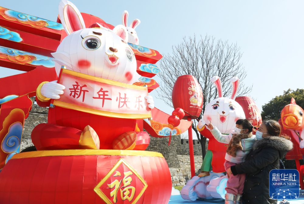 1月16日,在江苏省苏州市古胥门广场,小朋友在家长陪同下观赏彩灯“福兔迎春”。新华社发(杭兴微/摄)